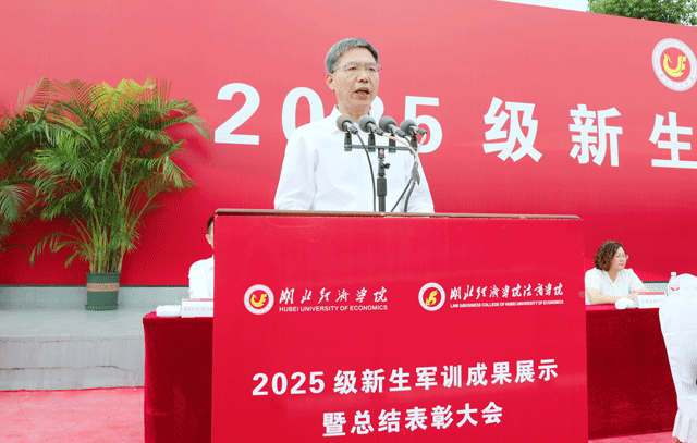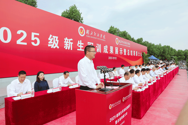 湖北经济学院党委副书记汪达向圆满完成军训任务的同学们表示热烈祝贺,向空军预警学院教官表示崇高的敬意和衷心的感谢。他对新生提出三点期望,一要筑牢爱国信仰的压舱石。历史是最好的教科书,英烈是最亮的指路灯。爱国从不是抽象的口号,而是融入每一件小事、每一次选择的具体行动。二要锤炼坚韧不拔的硬作风。先烈们用钢铁意志铸就了民族脊梁,今天的我们更要传承这份坚韧。三要传递接续奋斗的接力棒。烈士们未竟的事业,需要我们以不同方式接续担当。汪达寄语新生:“脱下迷彩服但英烈精神不褪,训练口号停歇但奋斗脚步不停滞,把军训中收获的爱国情怀、坚韧意志、团队精神带到今后的学习生活中,让青春在强国建设的征程中绽放光彩。”