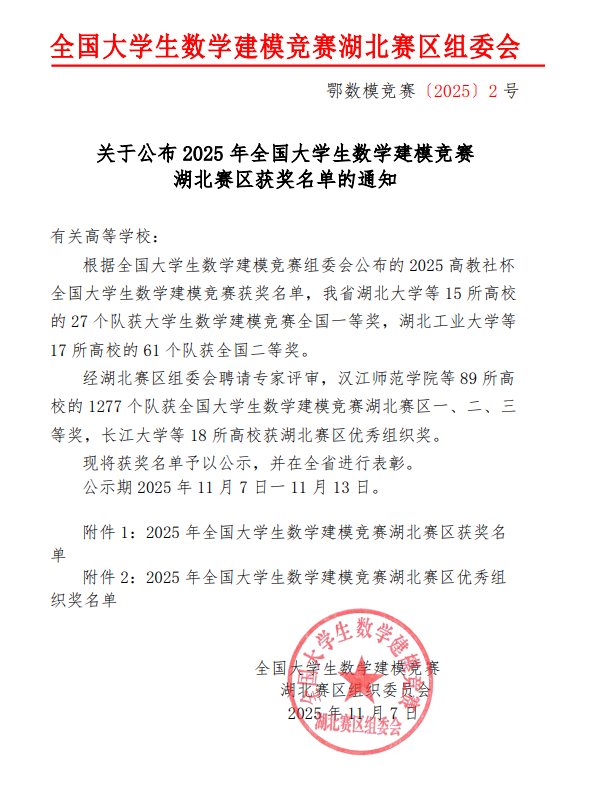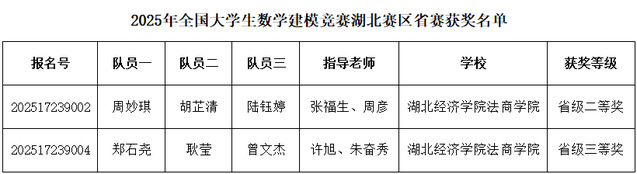 本网讯(通讯员 朱奋秀 吴天宇)近日,2025年全国大学生数学建模竞赛获奖名单揭晓。我院2支学生团队分别荣获省级二等奖1项、三等奖1项。
