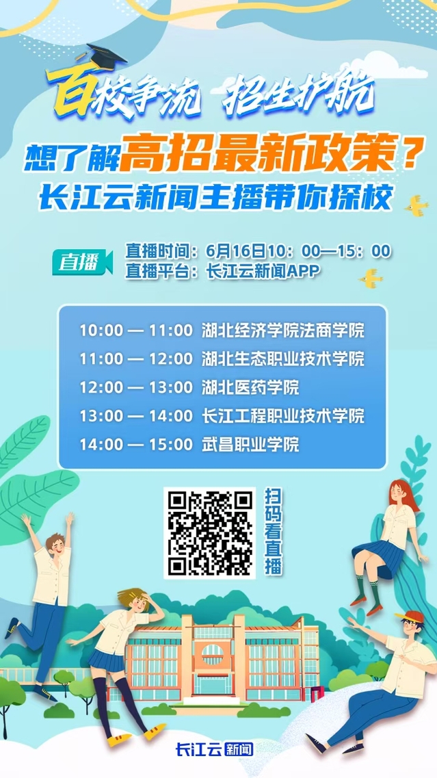 6月16日上午,由湖北省教育厅宣传中心、湖北广播电视台新闻中心联合湖北高校新媒体联盟发起的“百校争流 招生护航”大型探校直播活动正式开启。我院作为该直播的第一站,率先向全网展示校园风采,直播时长1小时。