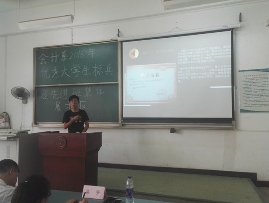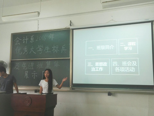本网讯(通讯员曾筝 梁芳)9月25日14时,会计系在教四-103成功举办了“优秀大学生标兵”及“先进班集体”展示评选会。会计系学生事务服务中心指导老师梁芳、辅导员胡远景、团总支副书记郑苏倩、学生事务服务中心副会长万赛应邀担任此次展示评选会的评委。