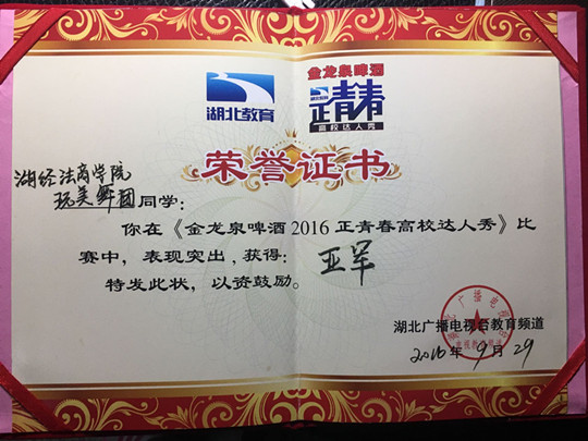本网讯(特约记者 李枥霖)9月28日晚,由共青团湖北省委、湖北广播电视台指导,湖北省学生联合会、湖北广播电视台教育频道主办的“2016金龙泉啤酒高校达人秀”总决赛在武汉设计工程学院体育馆落下帷幕,我院玩美舞团荣获亚军。
