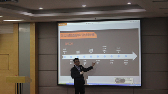 本网讯(记者 徐丽亨 通讯员 王梦飞 苏瑞)为促进毕业就业全程化教育的开展,促使广大金融学子走近专业,了解相关行业,10月19日晚18时50分,金融系组织的以“漫谈银行”为主题的金融专业知识讲座在大学生活动中心四号报告厅正式举行。本次活动特邀嘉宾兼主讲人为高顿财经特约讲师戴樊增(英文名Brady),他带领同学们揭开了银行业的神秘面纱。