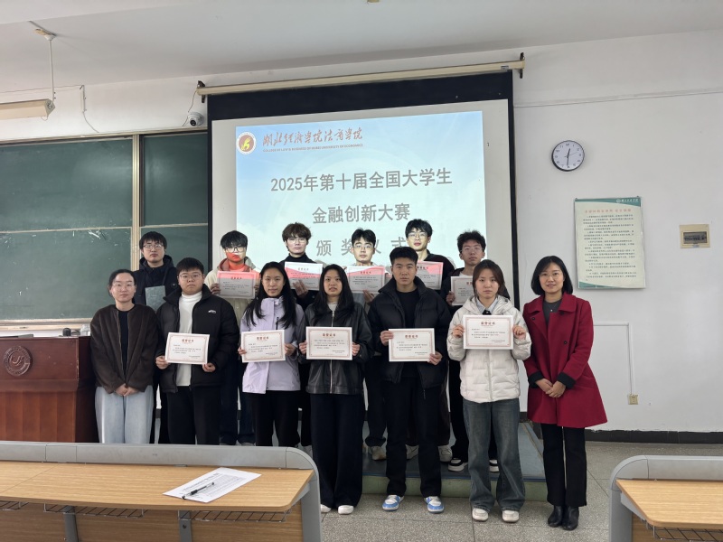 本网讯 12月2日,2025年第十届全国大学生金融创新大赛颁奖仪式在教四401教室举行。10位国赛获奖选手、31位校赛获奖选手、金融系副主任曾梦玲副教授和时珺老师参加。