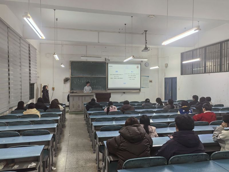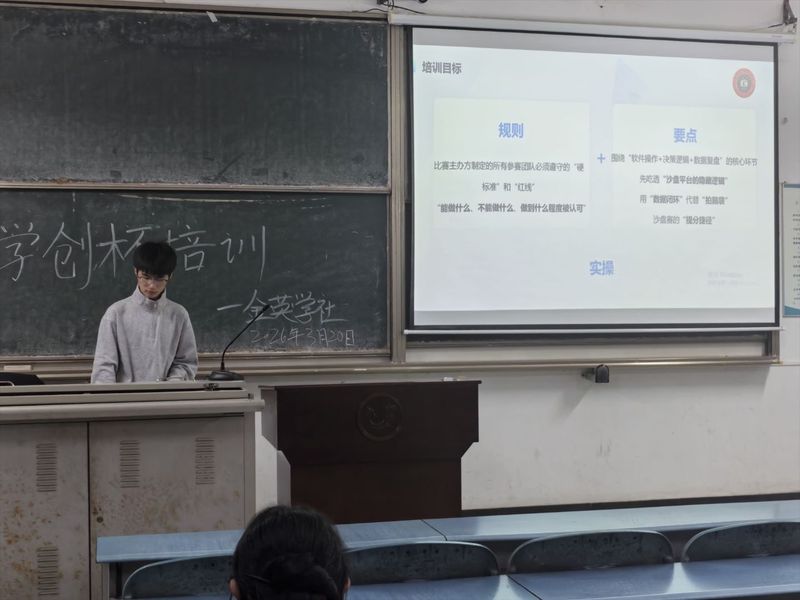 本网讯(通讯员 胡龙轩 摄影 胡龙轩)3201830分,金英学社于J4-103教室举办"学创杯"培训活动。本次活动邀请参赛获奖丰硕的2022级学长学姐王镇潇、郑静主讲,旨在解读赛事规则、梳理备赛要点、讲解实操技巧,吸引了众多有意向参赛的学生参与。