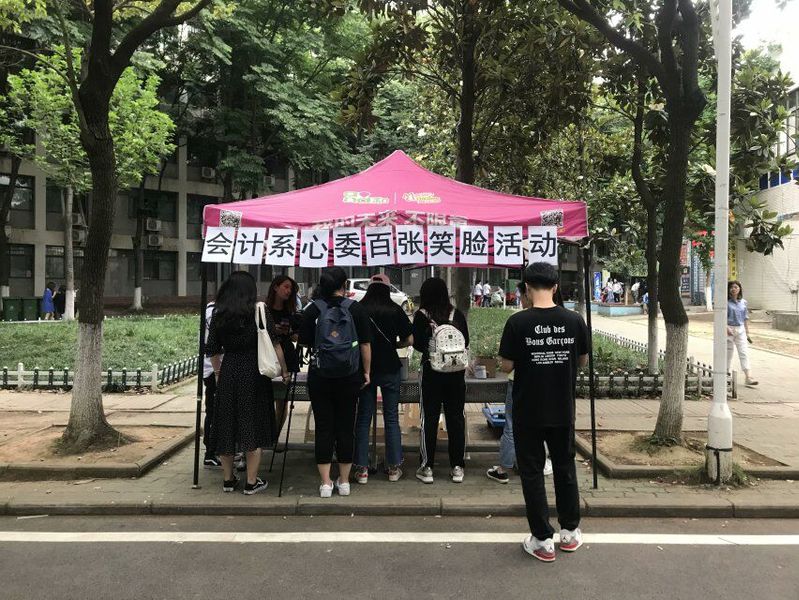 “百张笑脸”活动分为线上线下两个部分。笑脸征集线上线下同时进行,线上收集甜美自拍,线下摆点拍摄。同学们积极参与此次活动,摆点时间纷纷前来询问活动详情,拍摄笑脸照片并抽取小礼品,使摆点地充满了欢声笑语。