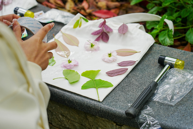 随后,会计系学子化身“自然艺术家”,带着工具在校园中寻觅形态各异的叶片与花瓣,精心挑选、巧妙搭配,将充满春日气息的植物素材固定在帆布袋上,手持小锤子轻轻敲打。随着一次次清脆的敲击声,植物的纹理与天然色素慢慢渗透布料,晕染出一幅幅独一无二的图案。创作过程中,同学们专注投入、相互交流技巧、分享创作灵感,原本素白的帆布袋渐渐染上了春日的斑斓色彩,每一件作品都承载着自然的温度与学子的创意,也寄托着大家对生活美学的热爱。