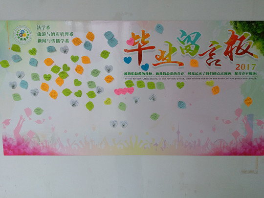 据悉,为保证毕业生能够安全有序、文明愉快离校,法旅新系多次召开毕业生离校工作协调会,部署离校工作。为营造温馨氛围,系部制作了《致毕业生一份信》、制作留言板,让学生在留言板上留言;给每一位学生发放了档案袋等。