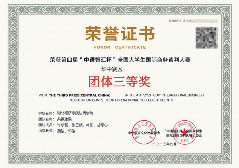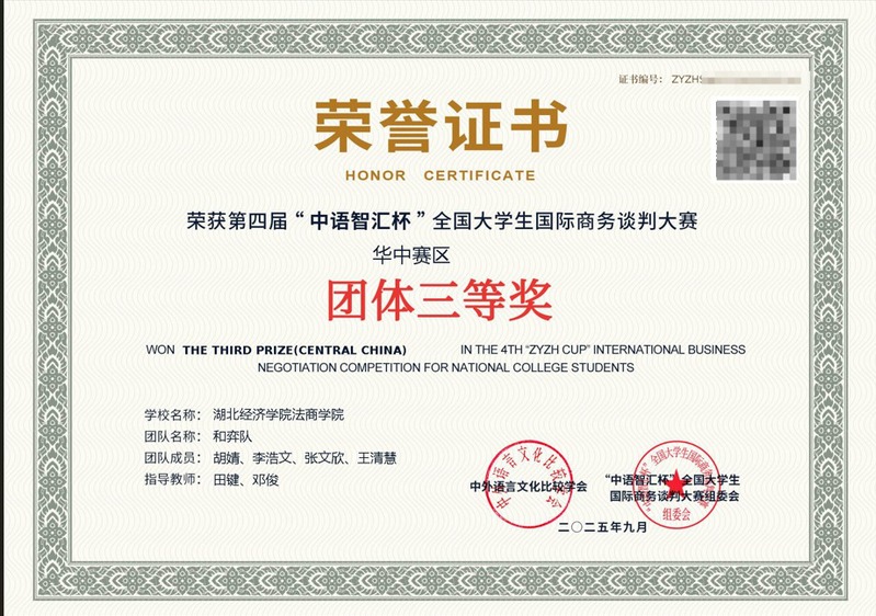 本网讯(通讯员 田键)日前获悉,第四届“中语智汇杯”全国大学生国际商务谈判大赛区域赛线上评审已圆满结束。经专家评审,最终有143支参赛队伍成绩有效。我院三支代表队在邓俊、蔡洁、田键、欧阳斌非等老师的精心指导下荣获三等奖。