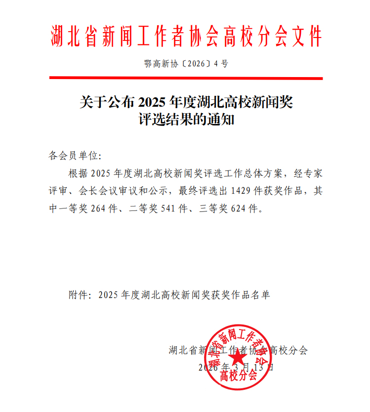 湖北省高校新闻奖作为我省高校新闻作品最高奖,由湖北省新闻工作者协会高校分会组织开展,每年评选一次,旨在发挥优秀新闻作品的示范引领作用,推动高校新闻媒体事业高质量发展。本年度湖北高校新闻奖共设文字消息、文字评论、通讯与深度报道、版面和页(界)面设计、副刊、新闻摄影、广播类作品、新闻视频类作品、融合创新、新闻标题、新闻论文等11个大类别。