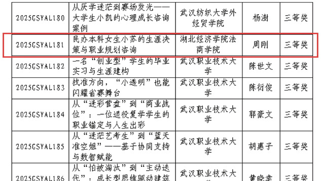 近日,湖北省生涯教育研究会公布2025年全省生涯教育优秀论文、生涯咨询和心理咨询案例评选结果,我院教师江美霖、周刚在评选中分别获奖。