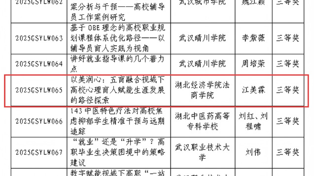 其中,在2025年湖北省生涯教育优秀论文评选活动中,江美霖老师撰写的《以美润心:五育融合视域下高校心理育人赋能生涯发展的路径探索》荣获三等奖。在2025年湖北省生涯咨询和心理咨询案例征集活动中,周刚老师撰写的《民办本科女生小苏的生涯决策与职业规划咨询》荣获三等奖。此次获奖,体现了两位教师在相关领域的持续积累,也是学院长期推进心理健康教育和生涯教育工作的具体成果。