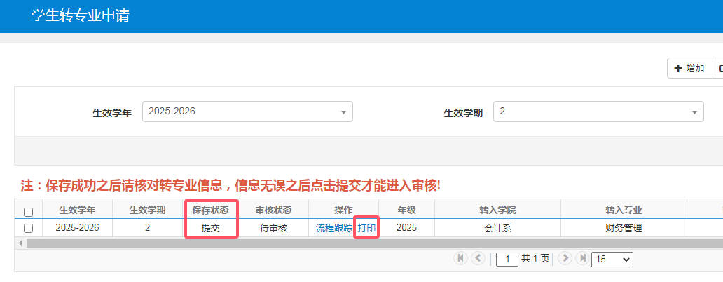 六、提交后条目显示提交状态及审核状态,点击【打印】生成《转专业申请表》。