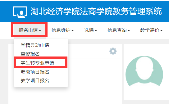 一、登录教务系统,点击【报名申请】——【学生转专业申请】