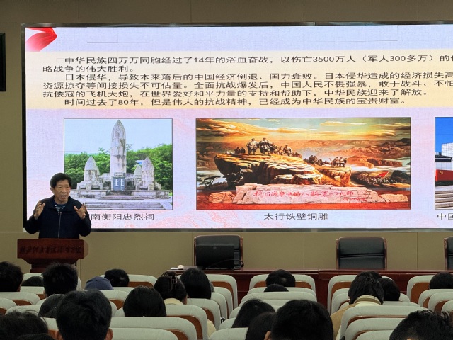 汤华明全面深入地讲述了抗战的经历、抗战的文化、抗战的精神,从“红军长征与北上抗日”先遣队的组建背景,到“反蒋抗日”向“联蒋抗日”的战略转变逻辑;从“卢沟桥事变”“平型关大捷”“淞沪会战”的战场战术交锋,到“华北抗日根据地建设”“正面战场系列会战”“中国远征军出国作战”“雪峰山会战”的全局战略布局。他结合一手史料、战役地图及将领事迹、作战数据,清晰阐释了各阶段抗战的战略价值,生动展现出中国军民“一寸山河一寸血”的抗争决心,同时着重强调了抗战精神在民族发展进程中的传承内核。详实的史料与鲜活的历史片段,既还原了抗战历程的艰辛,更让在场师生深刻理解了抗战精神的丰富内涵与时代价值。