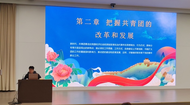 传媒与艺术设计系团总支副书记李昱澄老师以“把握共青团的改革与发展”为主题展开。通过梳理共青团改革发展脉络,解析改革举措、从严治团要求等内容,让同学们深刻理解共青团在时代浪潮中的变革与坚守,增强了对团组织发展的认知与认同。