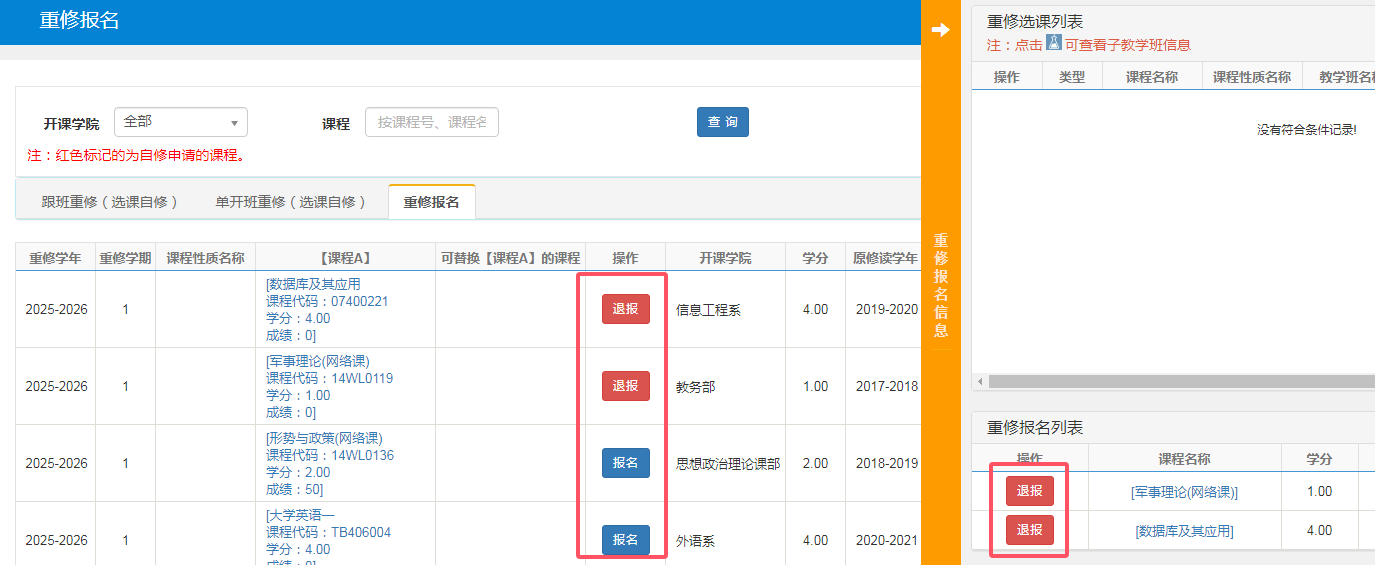 三、出现课程后点击【报名】,报名结束后点击右侧橙色区域可显示当前报名课程。如误报,可点击【退报】