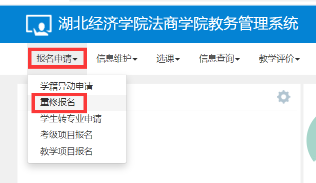 一、登录教务系统,点击【报名申请】——【重修报名】