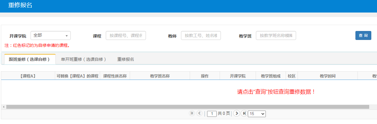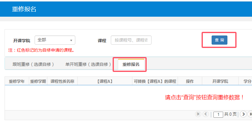 二、选择【重修报名】,点击【查询】。
