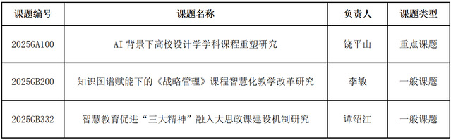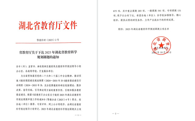 本网讯(通讯员 胡文红)近日,省教育厅发布了《关于下达2025年省教育科学规划课题的通知》(鄂教科研〔2025〕2号),我院3项课题获批立项,其中重点课题1项,一般课题2项。