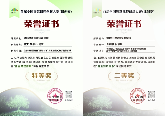 本网讯(通讯员 胡文红)11月21日,首届“智慧树杯”全国智慧课程创新大赛获奖名单正式公布。我院传媒与艺术设计系教师董文主讲的《设计概论》课程荣获“自主知识体系”课程赛道特等奖、会计系教师肖安娜主讲的《财务管理学》课程荣获“自主知识体系”课程赛道二等奖。值得一提的是,我院是湖北省本科高校中荣获特等奖的三所院校之一。