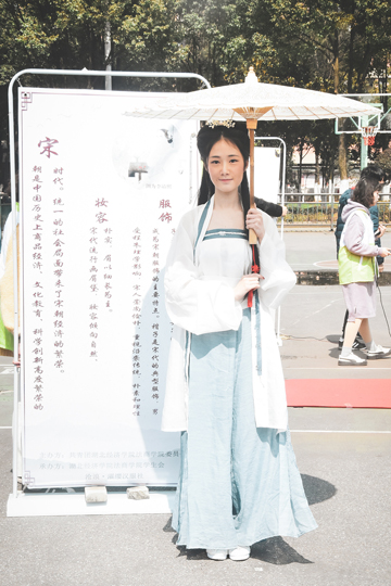 一名来自旅游管理学院的学生全神贯注的享受着这场文化盛宴,这样称赞道:这太美了!真是没想到在学校里能看见这样的汉服展示。太好了!”