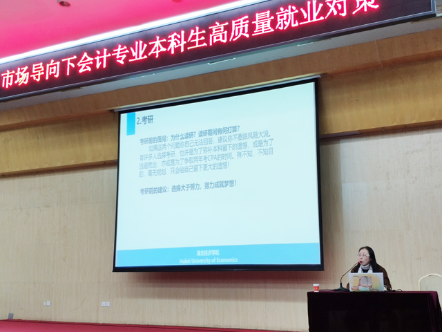 本网讯(通讯员 李粤雄)12月4日,会计系在大学生活动中心二号报告厅举行了“市场导向下会计专业本科生高质量就业政策”的讲座,邀请了湖北经济学院张庆教授为全体学生解读就业政策,促进2019届毕业生就业工作。院长王红教授、会计系党总支书记黄雯、团总支书记高志荣与现场近500名同学一同听取了报告,李粤雄老师主持。