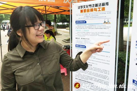 当天上午,九华厅的对面搭建起了“普法宣传”的橙色帐篷,各类实用的法律知识例如“网络购物维权”,“兼职合同与工资”被打印出来环形放置在了帐篷旁边供学生了解。身穿亮黄色的法学系学生会工作人员坐在橙色帐篷里,为来来往往的学生们解答各种法律疑惑与宣传法律的知识,并且他们还为对法律知识充满好奇的学生们准备了两项小游戏——一是“读法条”,即用普通话在工作人员面前将事先准备的法律条文读出来;二是“写法字”,即用毛笔在宣纸上写出“法”这一个汉字。参与这些小游戏的学生们有机会获得工作人员精心准备的陶瓷风铃或者毛绒玩偶一个。本次普法宣传活动除了线下的宣传活动,也有线上的参与形式——对法律知识有爱好的学生们可以加入“法旅新系法律咨询”QQ群,在其中与大量有着相同法律知识爱好的学生们一同交流与学习。