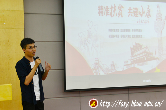 在讲“法商人”故事环节,参赛选手余卓然同学选择了一个群体——法商教务部全体老师,通过余卓然同学的讲述,让现场的老师和同学们更加清晰的了解了教务老师的工作内容和付出;吴伟同学则讲述了一群扶贫的“法商人”故事,他以刘乐乐老师为代表,讲述了学院积极响应国家扶贫政策,派出张谋华、刘乐乐、陈小俊组成扶贫工作组进驻荆州市监利利县黄歇口镇李场村,努力帮助当地发展经济摆脱贫困的帽子,当讲到扶贫工作从2015年10月就开始持续至今,现场响起了热烈的掌声。