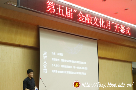 本网讯(特约记者 鲁聪 摄影 陈天一)3月29日晚7点,湖北经济学院法商学院第五届“金融文化月”开幕式在大学生二号报告厅正式拉开帷幕,国泰君安证券紫阳东路营业部总监米亚昆先生、营业经理黄重先生,金融系综合办副主任、团总支书记鲁聪出席了本次开幕式,全院近400名学生参加了开幕式。