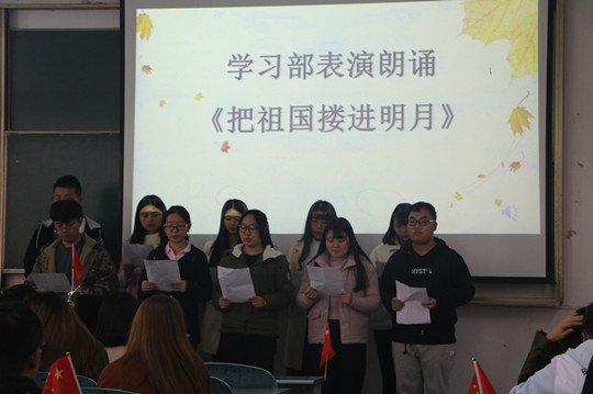 体育部慷慨激昂的诗歌《平凡之路》使团会的现场氛围迅速升温。随后,学习部用铿锵有力的朗诵《把祖国搂进明月》,其表演声情并茂,庄重又不失气势,同学们的情绪愈发浓郁。宣传部的舞蹈热情洋溢,赢得在场同学的喝彩。生活与权益保障部歌曲《最初的梦想》提醒所有青年团员要坚持自己最初的梦想。外联与社会实践部的话剧《不忘初心,做国之栋梁》则深刻的体现了本次团会的主题,升华了教育意义。最后大家齐声高喊:“因为有梦,所以远方”。团会圆满结束。