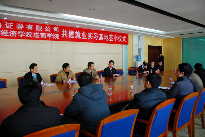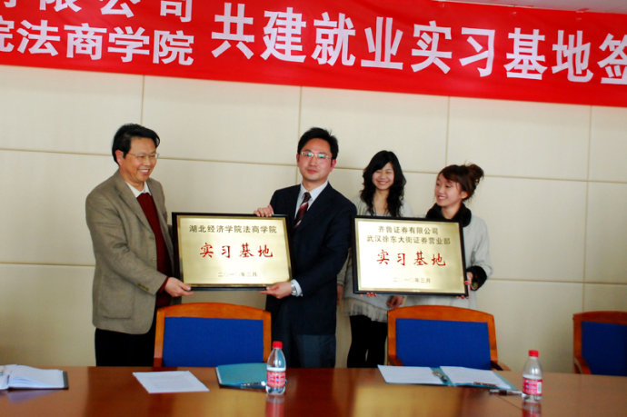 本网讯(通讯员江丹丹 记者戚琳 摄影高嵩 李鹏程)3月17日,湖北经济学院法商学院与齐鲁证券有限公司共建学生就业实习基地挂牌签约仪式在法商综合楼三楼会议室举行。湖北经济学院法商学院院长易作焕、副书记王厚生、副院长刘冶及全体综合办主任、金融系部分学生代表和齐鲁证券有限公司副总经理刘剑、区域经理邓玲、市场部经理雷长江出席了挂牌签约仪式。挂牌签约仪式由湖北经济学院法商学院副书记王厚生主持。