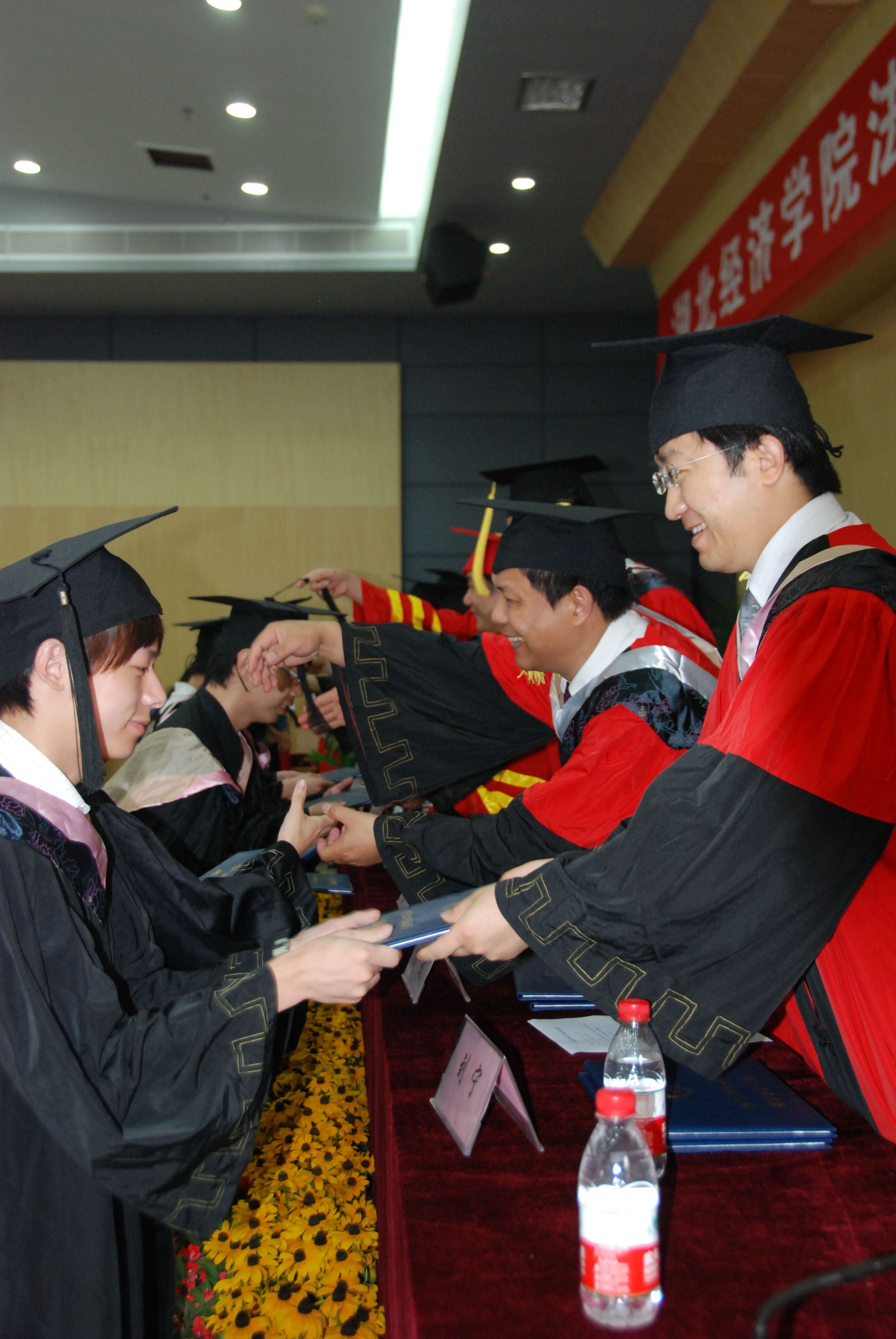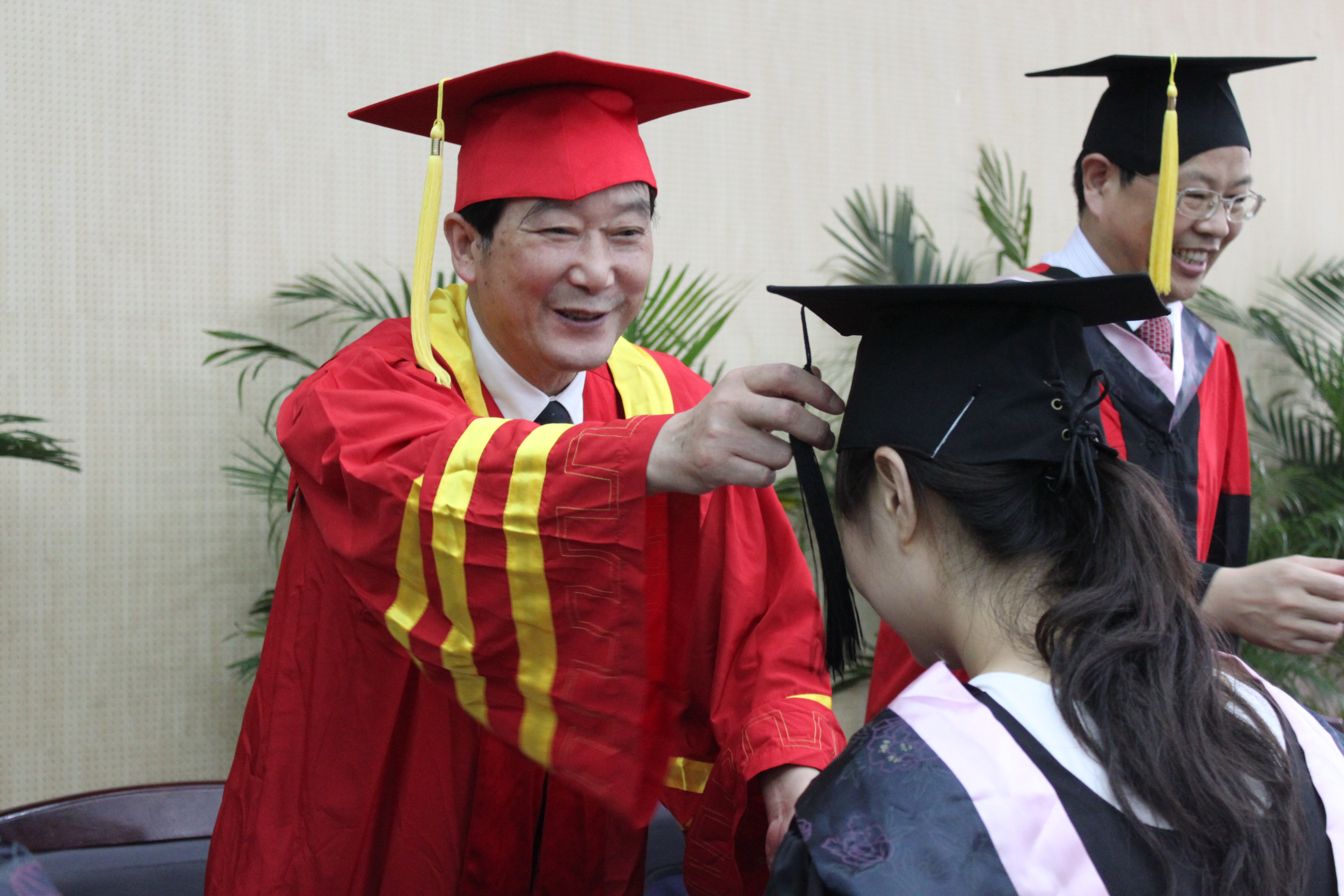 在随后的学位授予仪式中,院领导和系(部)负责人分别为获得学位的毕业生代表一一授予学位,拨正流苏。