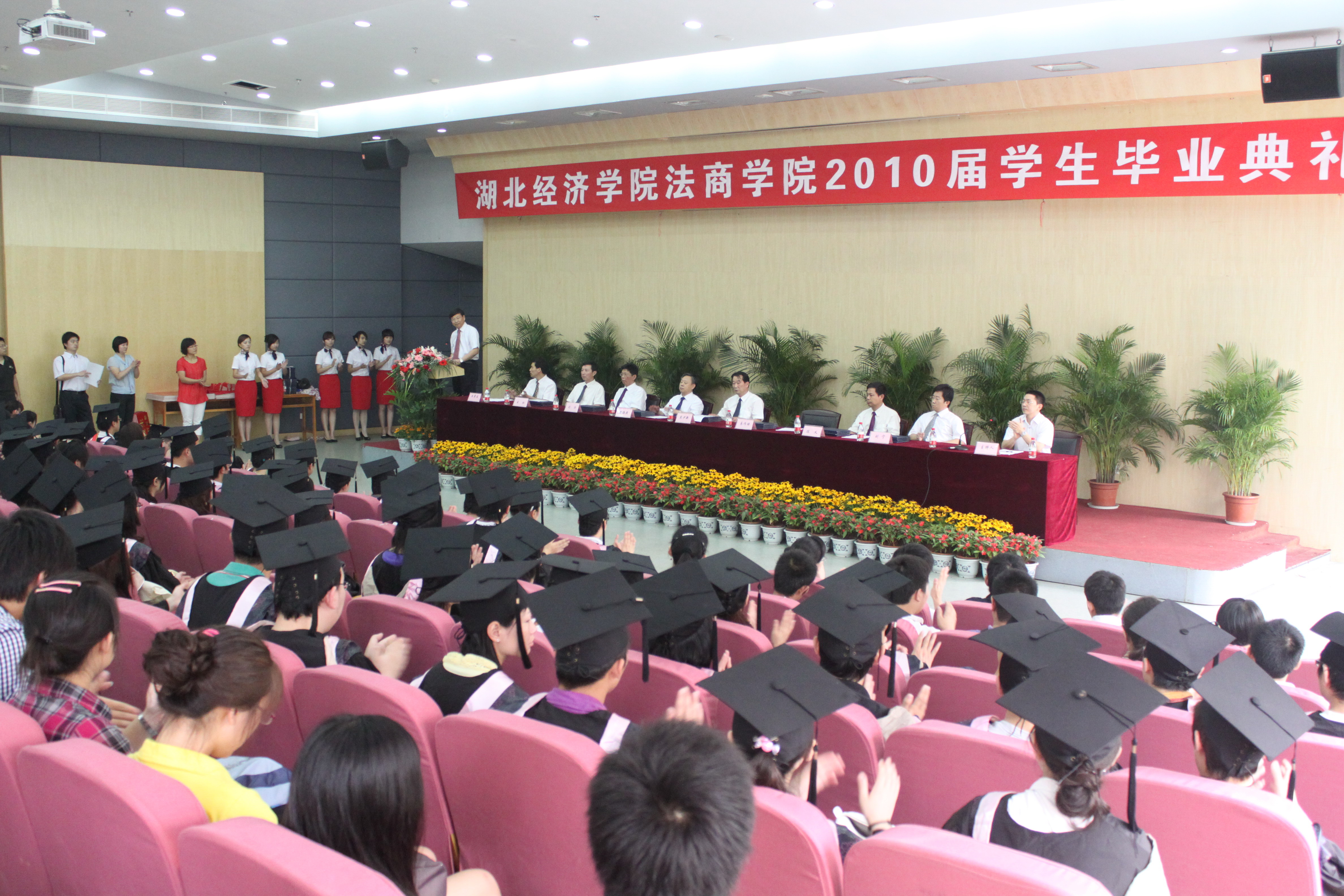 本网讯(记者 罗景辉 李钢 高嵩 徐衍) 6月22日上午,我院2010届毕业生典礼在学术报告厅二号报告厅隆重举行。湖北经济学院副院长、法商学院董事长吴少新,院长易作焕,党委书记曾海燕,副书记、副院长王厚生,副院长刘冶、黄华和教学系(部)主任出席了典礼。各系综合办负责人、毕业班辅导员以及2010届毕业生代表参加了大会。毕业典礼由副院长黄华主持。