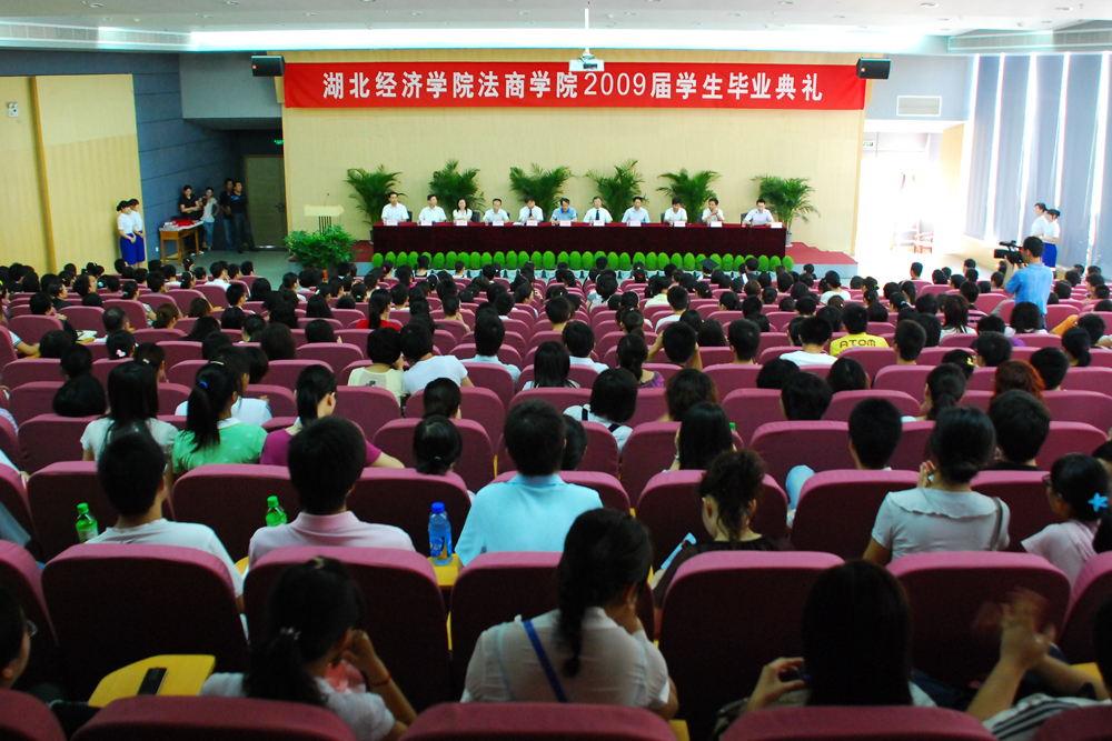 毕业典礼在嘹亮的国歌声拉开序幕。大会上,院长易作焕发表了热情洋溢的致词:“岁月不居,天道酬勤”。 几年来,同学们在专业学习、校园文化、体育活动、社会实践等方面取得了可喜成绩。2009届毕业生中有32人考取了武汉大学等高校硕士研究生,213人被评为优秀毕业生,387人光荣加入了中国共产党,182个集体、6800余人次获得校级以上表彰,15名毕业生志愿到贫困地区参加资教工作,还有59名学生荣获省级各类竞赛大奖。易院长说:“法商学院的发展壮大,同学们不仅是见证者和受益者,更是学院发展的参与者和支持者,你们用自己的执着追求和勤奋学习为学院的建设和发展贡献了应有的力量,母校感谢你们!”